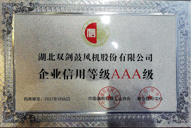 雙劍風機憑借雄厚的生產(chǎn)經(jīng)營實力和良好的市場信譽,被中國通用機械工業(yè)協(xié)會(CGMA)和商業(yè)信用中心授予“企業(yè)信用等級AAA級”榮譽。